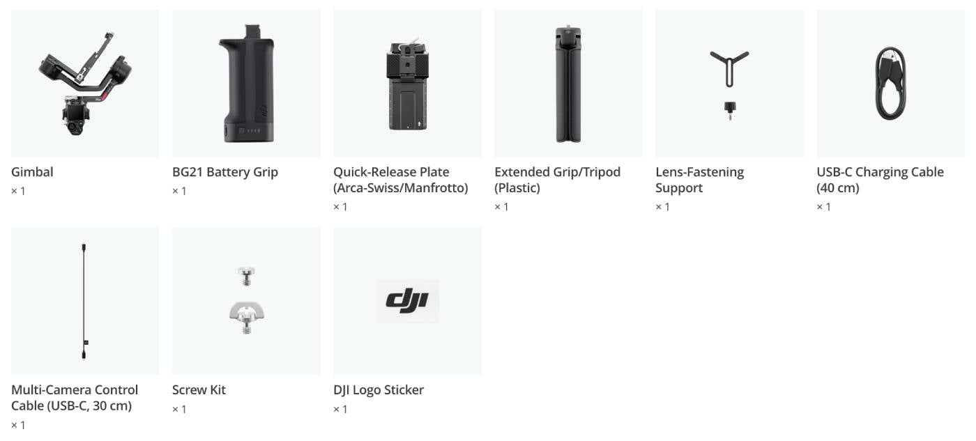 Phiên bản độc lập DJI RS 4 bao gồm Tay cầm pin BG21, Đế tháo lắp nhanh (Arca-Swiss/Manfrotto) và các phụ kiện thiết thực khác. DJI RS 4 Combo bao gồm các phụ kiện bổ sung như Động cơ Focus Pro, Tay cầm cặp và Hộp đựng. Với Động cơ Focus Pro được lắp đặt, các nhà quay phim có thể điều khiển lấy nét thông qua núm xoay hoặc điều chỉnh zoom ống kính thông qua cần điều khiển. Thao tác mượt mà này cho phép điều khiển ống kính hiệu quả.