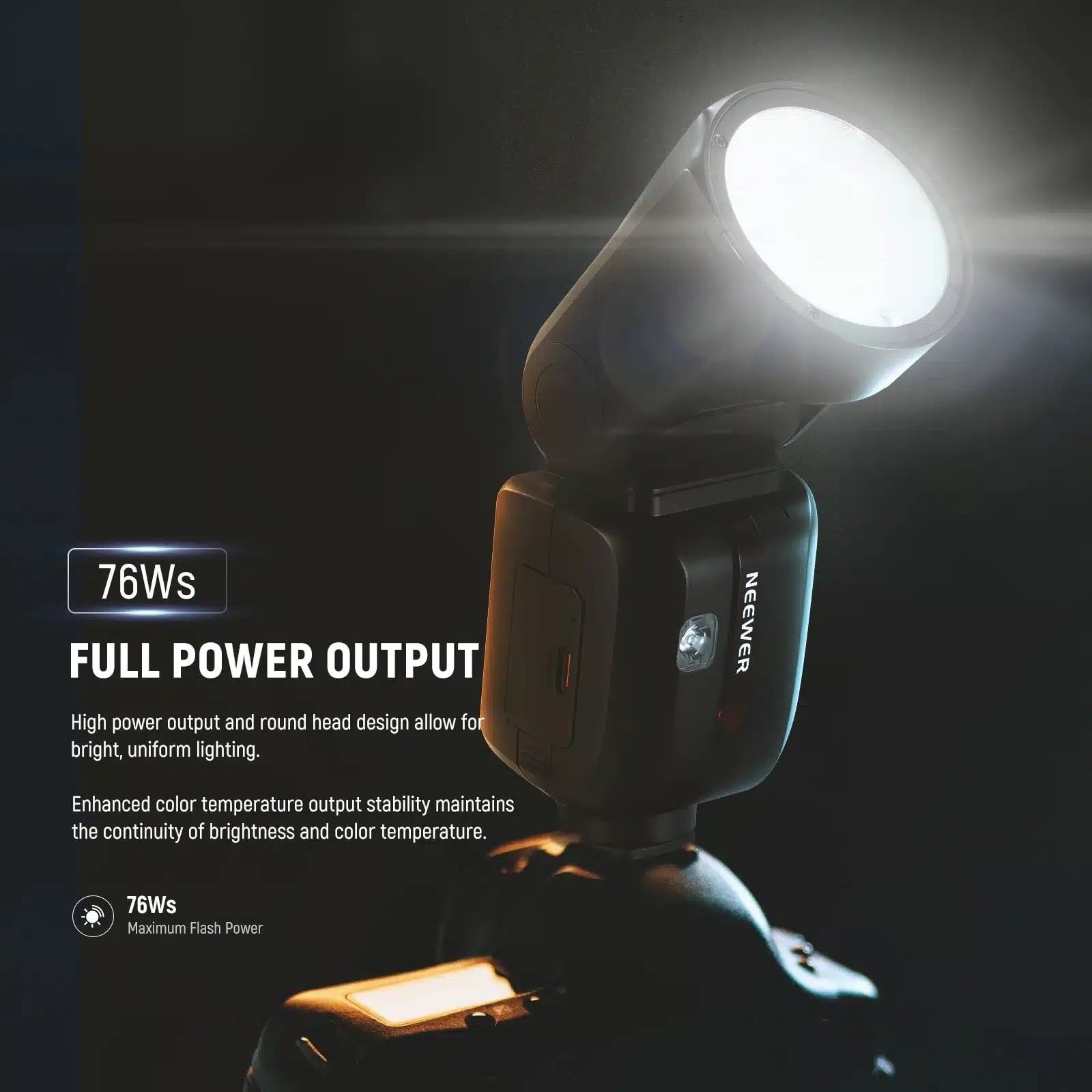 Công suất 76Ws, với ống thạch anh bền bỉ (100,000 lần nháy). Đầu flash tròn xoay 330 độ và nghiêng -7 độ đến 120 độ cho ánh sáng mềm, linh hoạt.