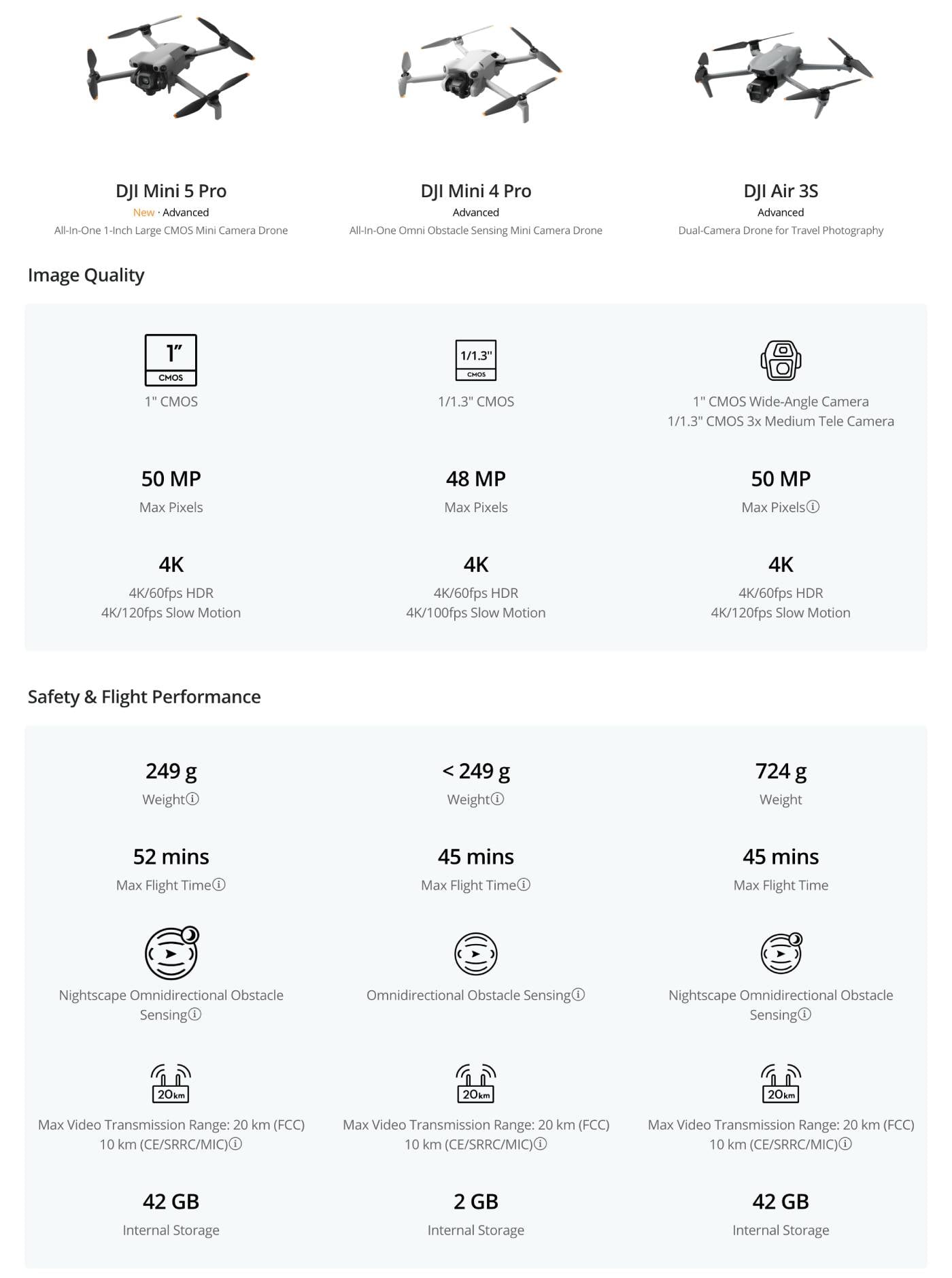 | Energy | DJI Mini 5 Pro Intelligent Flight Battery: 19.52 Wh DJI Mini 5 Pro Intelligent Flight Battery Plus*: 33.51 Wh |