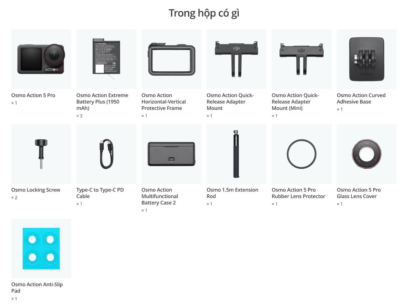 Osmo Action 5 Pro tương thích với hầu hết các phụ kiện từ thế hệ trước. Để biết chi tiết, vui lòng tham khảo trang tương thích phụ kiện của Osmo Action 5 Pro. DJI cũng đã giới thiệu các phụ kiện mới như Tay cầm sạc đa năng Osmo Action, Kẹp gắn cằm mũ bảo hiểm Osmo, Bộ mở rộng đế giữ lạnh Osmo Action và Giá đỡ Osmo Flex để giúp bạn mở khóa khả năng quay phim đa dạng hơn.