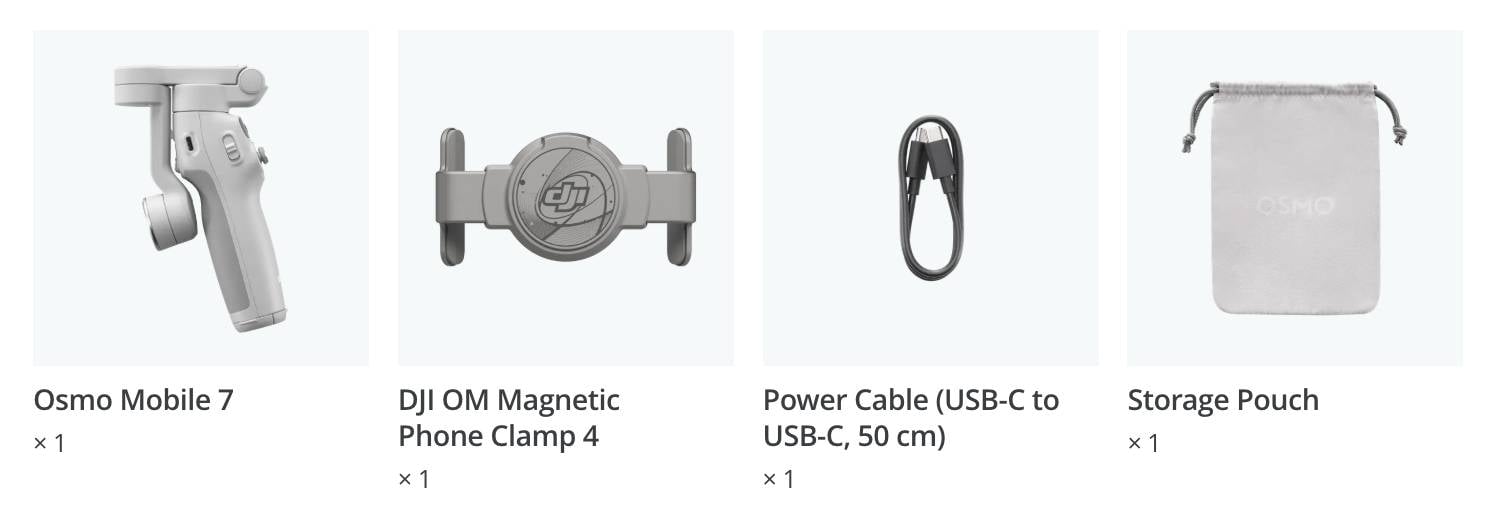 | Cân nặng | Osmo Mobile 7P Gimbal + Chân máy tích hợp + Kẹp điện thoại từ tính + Mô-đun đa năng: Khoảng 368g Osmo Mobile 7 Gimbal + Chân máy tích hợp + Kẹp điện thoại từ tính: Khoảng 300g |