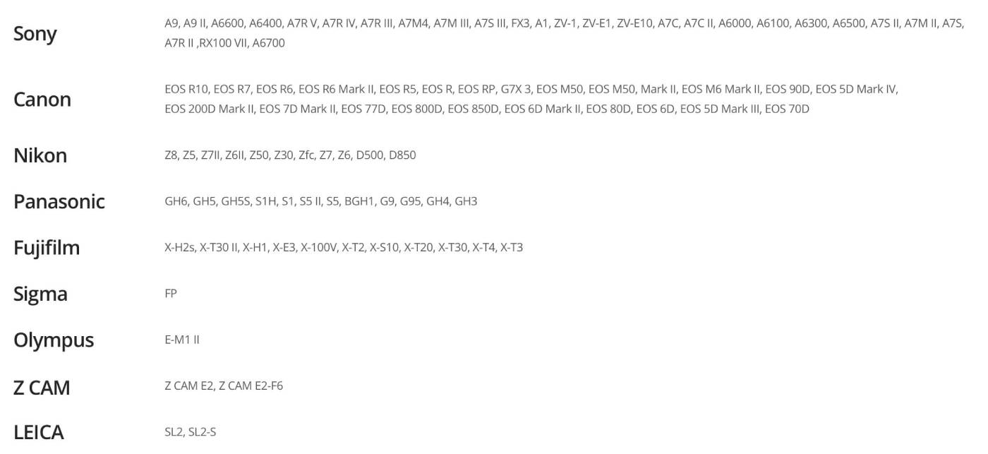 Danh sách camera tương thích gimbal