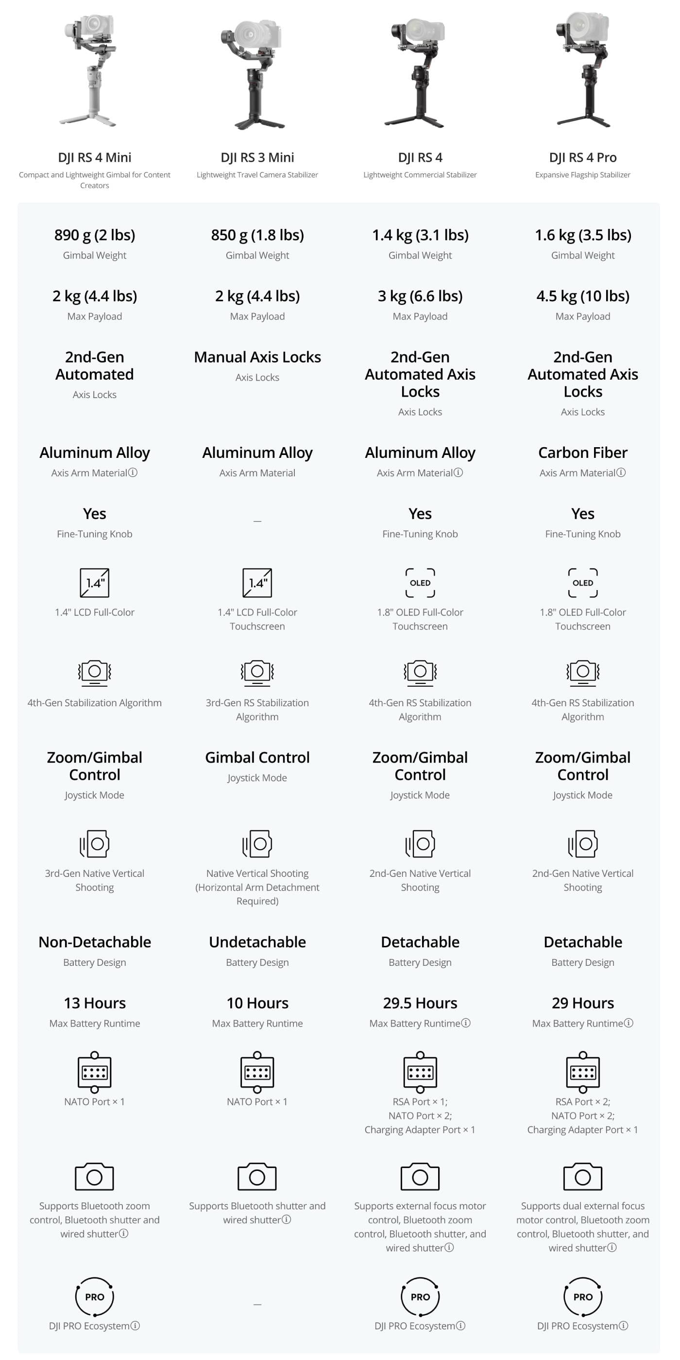 | Cân nặng | Gimbal: Approx. 1066 g (2.35 lbs) Grip: Approx. 203 g (0.45 lbs) Extended Grip/Tripod (Plastic): Approx. 183 g (0.4 lbs) Upper and Lower Quick-Release Plates: Approx. 98 g (0.22 lbs) |