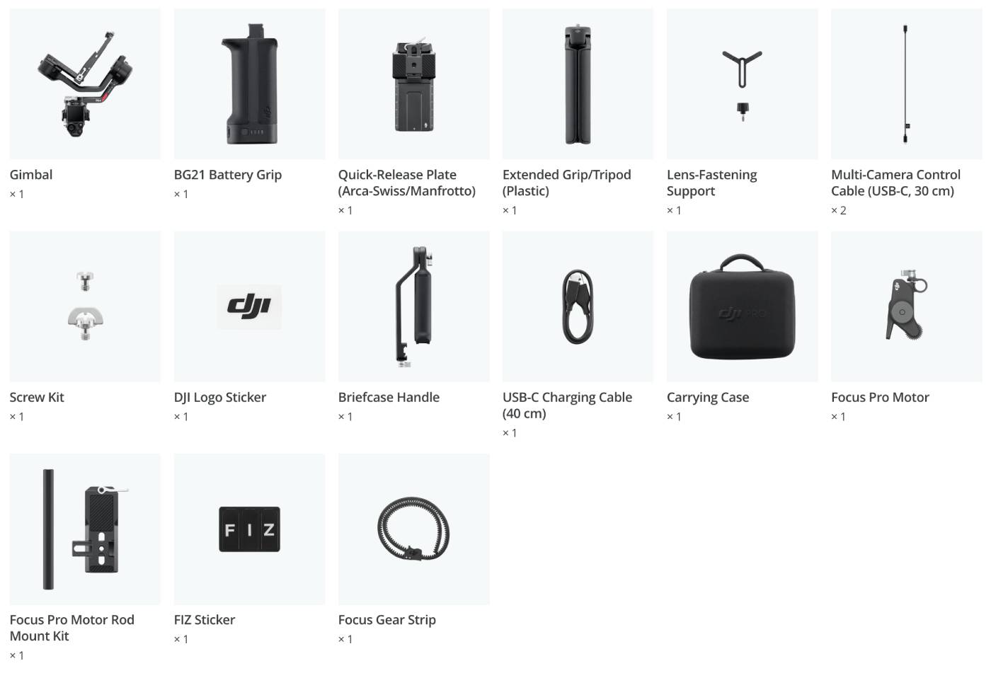 Phiên bản độc lập DJI RS 4 bao gồm Tay cầm pin BG21, Đế tháo lắp nhanh (Arca-Swiss/Manfrotto) và các phụ kiện thiết thực khác. DJI RS 4 Combo bao gồm các phụ kiện bổ sung như Động cơ Focus Pro, Tay cầm cặp và Hộp đựng. Với Động cơ Focus Pro được lắp đặt, các nhà quay phim có thể điều khiển lấy nét thông qua núm xoay hoặc điều chỉnh zoom ống kính thông qua cần điều khiển. Thao tác mượt mà này cho phép điều khiển ống kính hiệu quả.