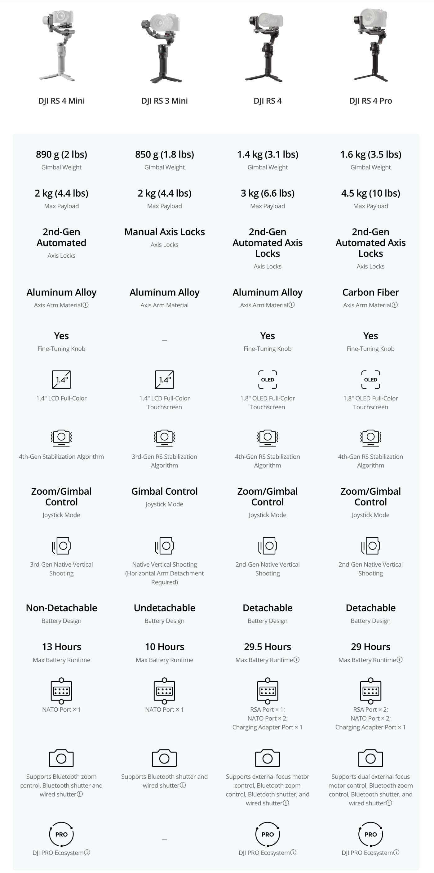 | Cân nặng | Gimbal: xấp xỉ 890 g (2 lbs) (bao gồm Đế tháo lắp nhanh và không bao gồm chân máy) Tay cầm mở rộng/chân máy: xấp xỉ 140 g (0,3 lbs) |