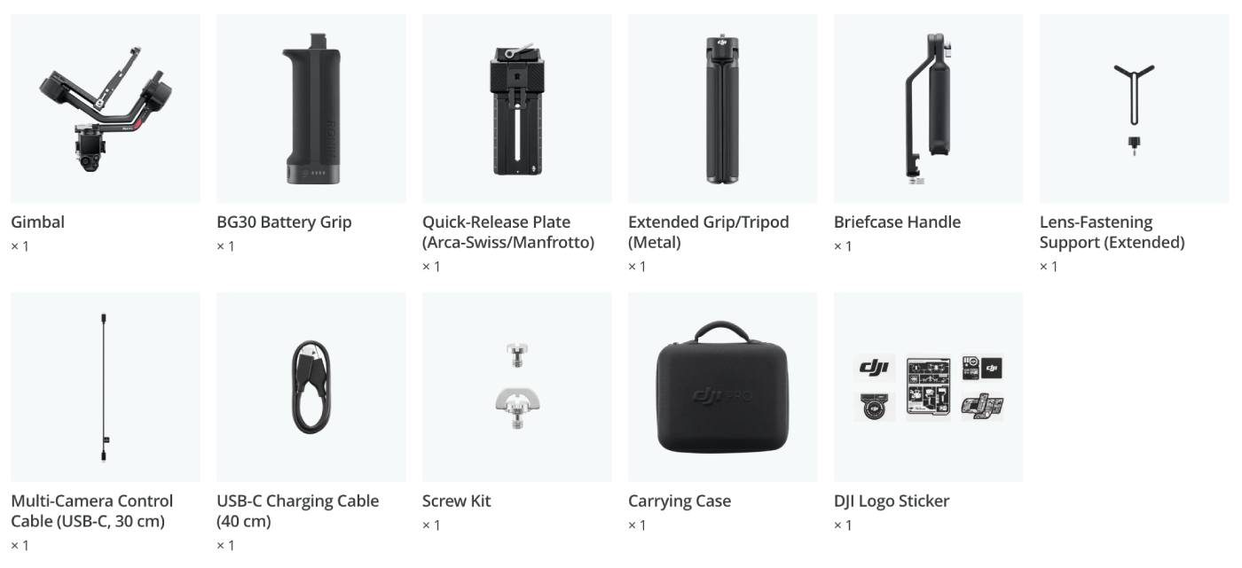 Phiên bản độc lập DJI RS 4 Pro bao gồm Tay cầm pin BG30, Đế tháo lắp nhanh (Arca-Swiss/Manfrotto), Tay cầm cặp, Hộp đựng và các phụ kiện thiết thực khác. DJI RS 4 Pro Combo bao gồm các phụ kiện bổ sung như Bộ truyền hình ảnh Ronin và Động cơ Focus Pro, giúp các nhà quay phim dễ dàng đạt được khả năng ổn định, truyền tải và điều khiển tích hợp trong công việc sáng tạo.