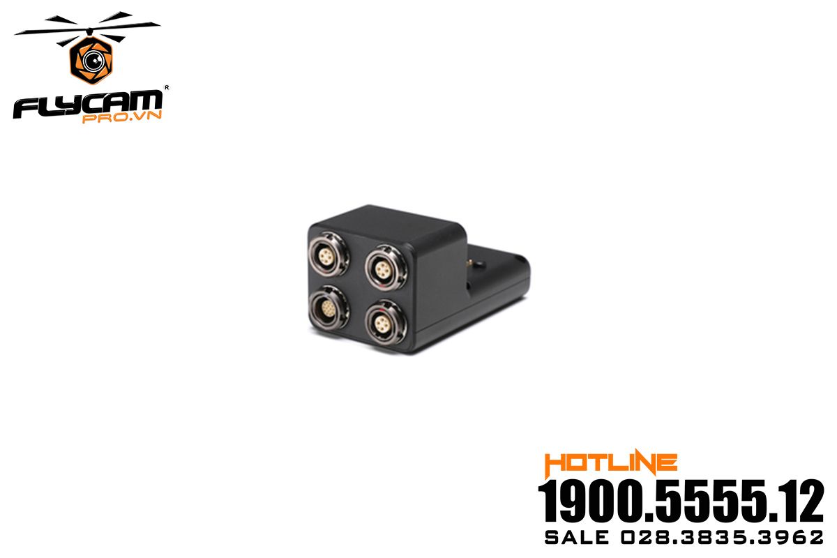 The Power Hub mounts to the pogo-pin connection point on the Ronin 2. It features rear-facing ports preventing cable connectors from interfering with other accessories such as lens control systems.